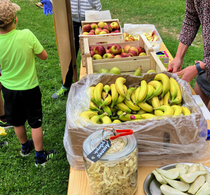 Bei fantastischem Wetter wurden Bananen, Äpfel, Birnen und getrocknete Ananas von den Eltern für die fleißigen Sportlerinnen und Sportler vorbereitet, angepriesen und ausgeteilt. Die überraschende Lieferung von drei großen Wassermelonen war ein willkommener Durstlöscher. Ein Bollerwagen bzw. der Vitamin Express hat die Kinder an Ihrem aufgeschlagenem Lagern mit Vitaminen versorgt.